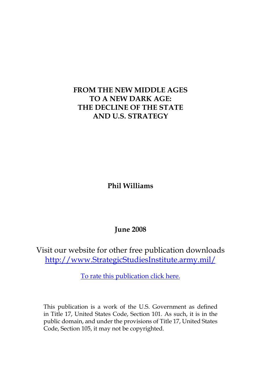 The author contends that the long-term decline of the state will move the world into a New Dark Age in which the forces of chaos and disorder will be almost overwhelming. Alternative options for the U.S. response to the security challenges posed by such an environment are examined.