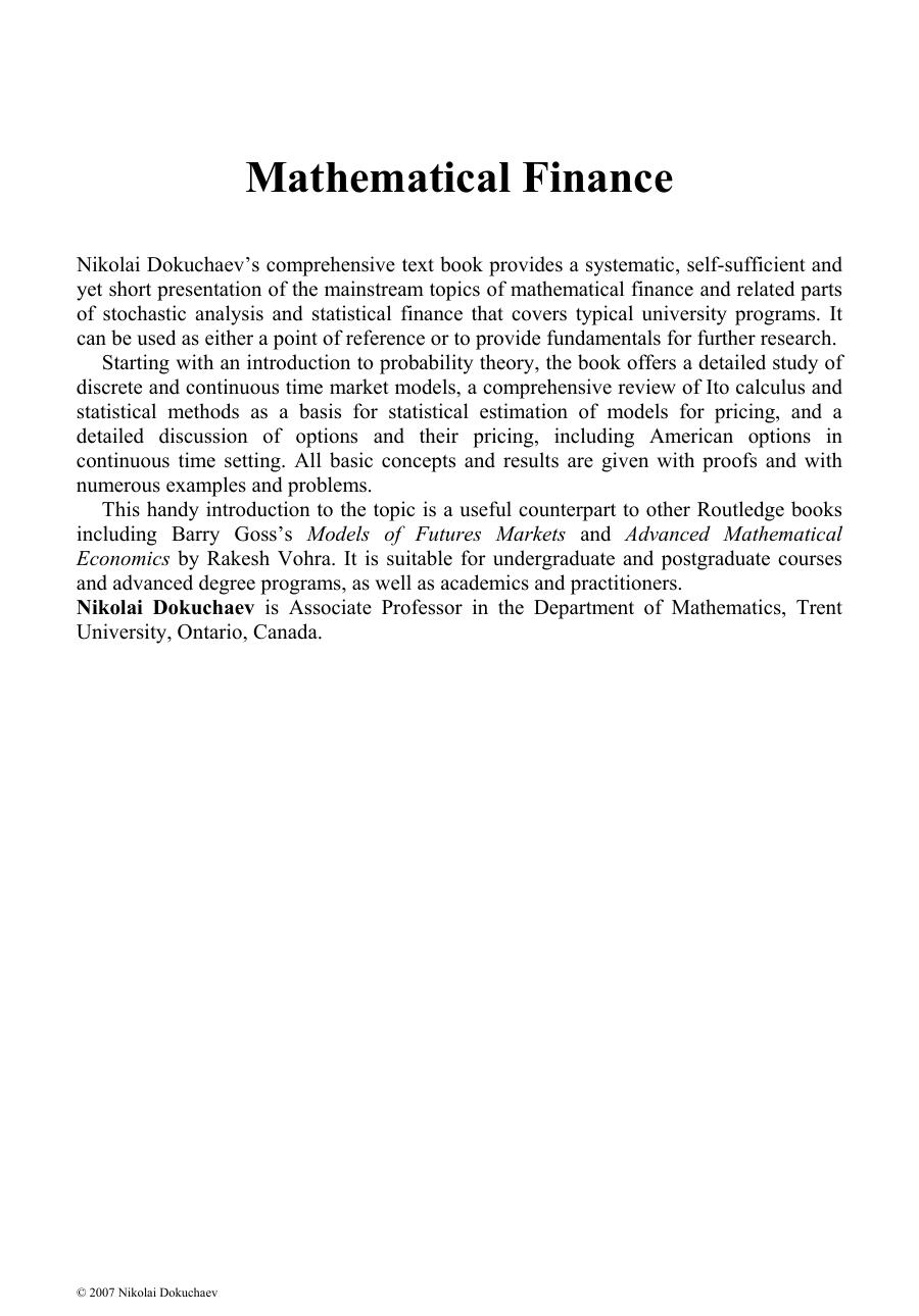 Title Mathematical Finance: Core theory, problems and statistical algorithms